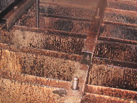 (1) gas phase cleaning for distillation unit in heavy oil and hydrogen sulfide (H2S), iron sulfide (FeS), light hydrocarbon cleaning, after cleaning device inside the device without oil, hydrogen sulfide and other toxic gases content is 0, the scene observation device of internal heat exchanger, tower partial residual sludge, most you can see the color of the metal wall device equipment. As shown in figure -3 to 6.