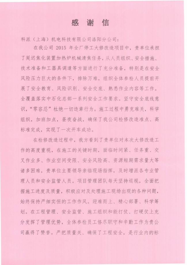 來自中石化青島煉化的感謝信 發(fā)布時間:2015-09-01作者:點擊:3298字號:大中小 上一篇:科派公司順利通過QHSE年度評審 下一篇:科派公司管理團隊參加“管理鐵軍”培訓(xùn) 分享到:0 用手機看 拍下二維碼,信息隨身看 試試用微信掃一掃,在你手機上繼續(xù)觀看此頁面。